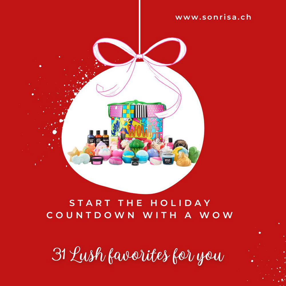 Aber dann dachte ich, dass Du es vielleicht lustiger findest, zum Auftakt des Weihnachtscountdowns erst einmal selbst ein Geschenk zu bekommen, bevor Du Dich um die Bescherung Deiner Liebsten kümmerst. Und habe darum beschlossen, dass heute der perfekte Tag ist für eine Verlosung mit besonderem Wow-Faktor im wahrsten Sinne des Wortes: Das WOW-Geschenkset von Lush im Wert von 365 CHF (!) enthält eine sorgfältig kuratierte Auswahl aus insgesamt 31 beliebten Klassikern und limitierten Neuheiten für festliche Vibes im Bad, unter der Dusche und bei der täglichen Pflege-Routine.