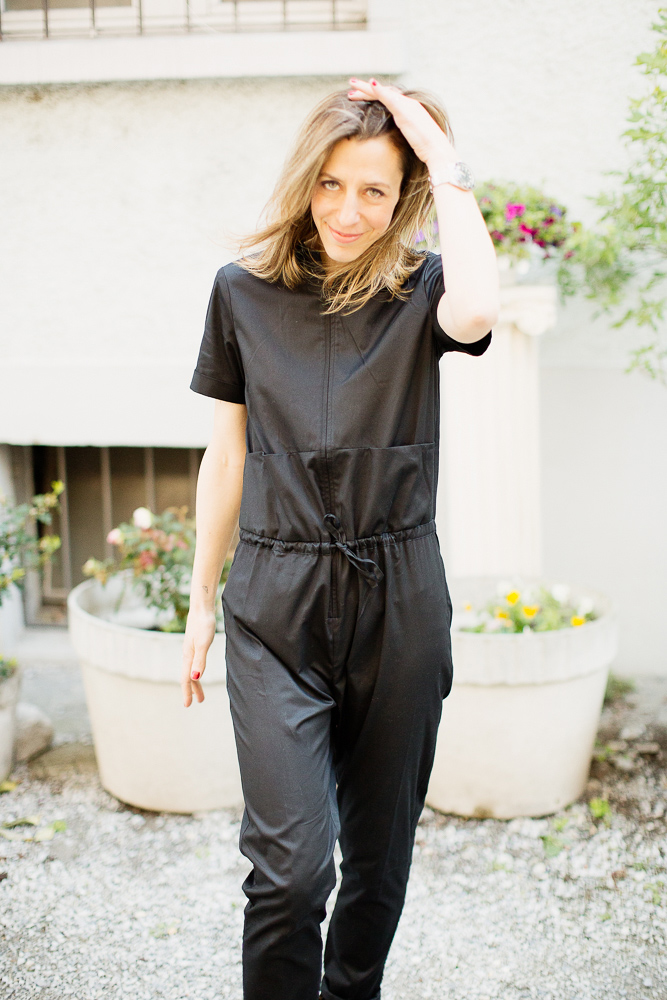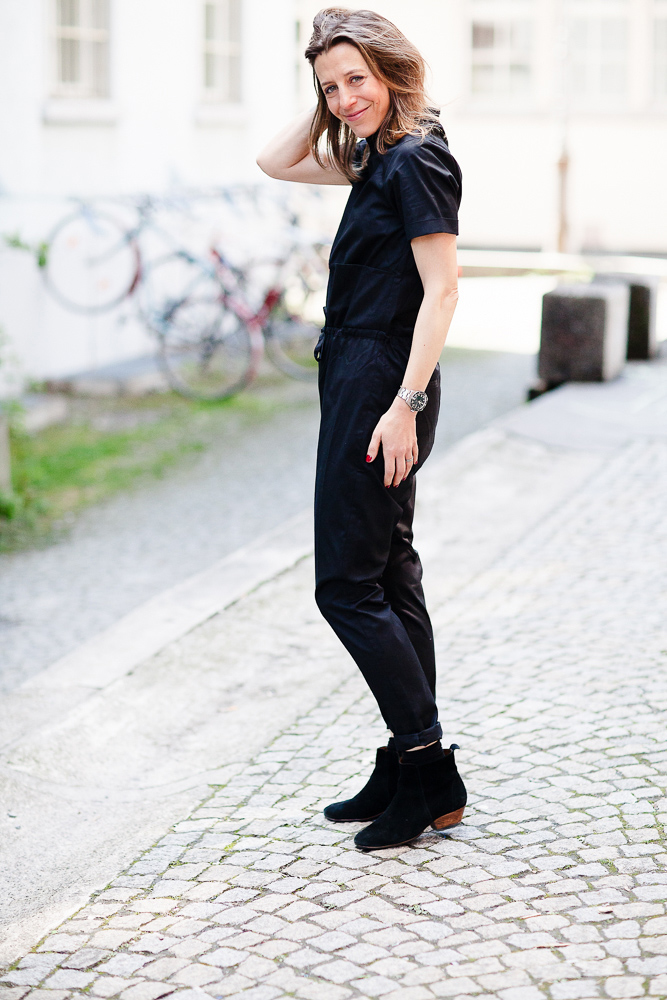 Nach einem Rundgang über den Fair Fashion Market wurde schnell klar, dass ethische Mode nicht nur wichtig ist, sondern vor allem auch richtig gut aussehen kann. Besonders angetan hat es mir der schwarze Jumpsuit in Bio-Qualität des Zürcher Labels Junglefolk aus dem Atelier der reizenden Pauline, die mir das gute Stück für ein spontanes Foto-Shooting mit der reizenden Jolie Zocchi  (von der alle die Bilder in diesem Blogpost stammen) ausgeliehen hat. Damit ich Dir an dieser Stelle zeigen kann, dass Fair Fashion ein grosses Spässli-Potential hat, ohne dass dafür jemand leiden musste. (Ausser vielleicht ein besonders mode-affiner Betrachter dieses Bildes, der sich fragt, warum diese Söckchen so unschön aus den Vintage-Boots von Isabel Marant herausblitzen…)